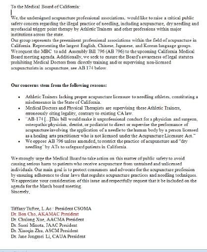 저희는 캘리포니아 주 내 침술 분야에서 선도적인 전문가 협회들을 대표하며, 캘리포니아 내에서 가장 큰 영어, 중국어, 일본어, 한국어 사용자 그룹들을 대표합니다. 우리는 캘리포니아 의료 위원회에게 AB 796 (AB 796)를 다음 캘리포니아 의료 위원회 회의 안건에 추가할 것을 요청합니다. 또한, 의사가 침술사가 아닌 사람에게 직접 침술을 가르치거나 감독하는 것을 금지하는 법률 규정에 대한 위원회의 인식을 확보하고자 합니다. 이에 대한 법률은 아래 AB 174를 참조하십시오.
